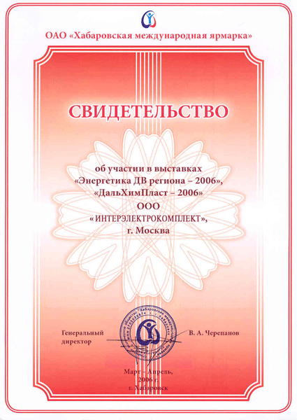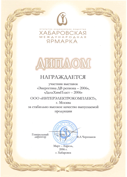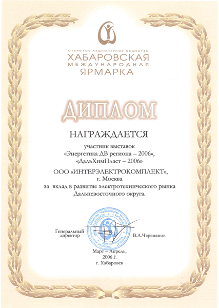 Сразу с тремя дипломами вернулись из Хабаровска представители компании «ИНТЕРЭЛЕКТРОКОПЛЕКТ». Традиционная для компании выставка «Энергетика ДВ региона – 2006» собрала участников со всей России. Организаторы выставки отметили представленные на стенде компании разработки дипломом «За стабильно высокое качество выпускаемой продукции», а сама компания отмечена дипломом «За вклад в развитие электротехнического рынка Дальневосточного округа». Вместе со своими партнерами Группа компаний IEK поставляет в регион широкий ассортимент электротехнической продукции. В рамках выставки дальневосточники познакомились с новинками 2006 года – переносными УЗО-адаптерами.