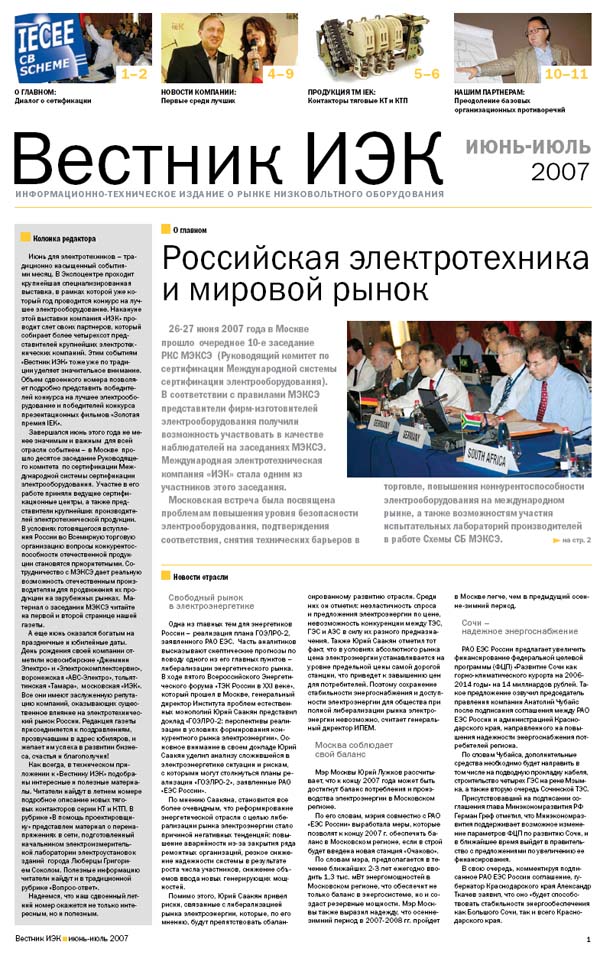 Первополосный материал «Вестника IEK» посвящен заседанию Руководящего комитета по сертификации Международной системы сертификации электрооборудования. В техническом приложении летнего номера читатели найдут подробное описание новых тяговых контакторов серии КТ и КТП. В рубрике «в помощь проектировщику» представлен материал о перенапряжениях в сети.