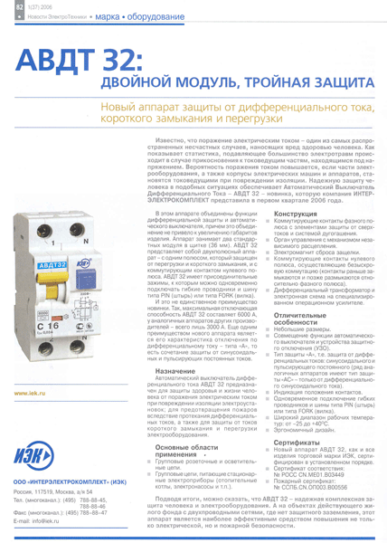 Известный электротехнический журнал «Новости ЭлектроТехники» опубликовал статью об одной из новых разработок Группы компаний IEK - АВДТ 32. В журнальной статье подробно представлены конструкционные особенности новинки, область ее применения и конкурентные преимущества.