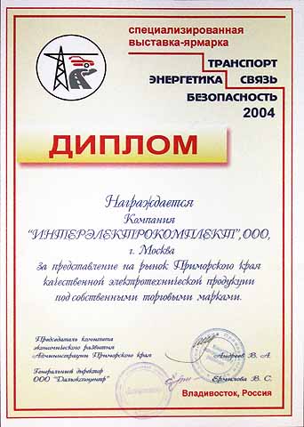 награждена Дипломом «За представление на рынок Приморского края качественной электротехнической продукции под собственными торговыми марками» от имени Председателя комитета экономического развития Приморского края В.А.Андреева и Генерального директора ООО «Дальэкспоцентр» В.С.Ермилова.