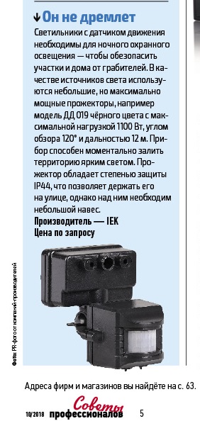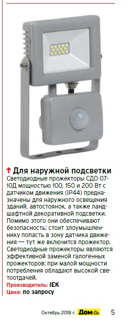 Светильники с датчиком движения необходимы для ночного охранного освещения. IEK GROUP предлагает использовать небольшие по размеру, но максимально мощные прожекторы ДД 019 с максимальной нагрузкой 1000 Вт, углом обзора 120ͦ и дальностью 12 м. Прибор способен моментально залить территорию ярким светом. Прожектор можно держать на улице, но над ним необходим небольшой навес.