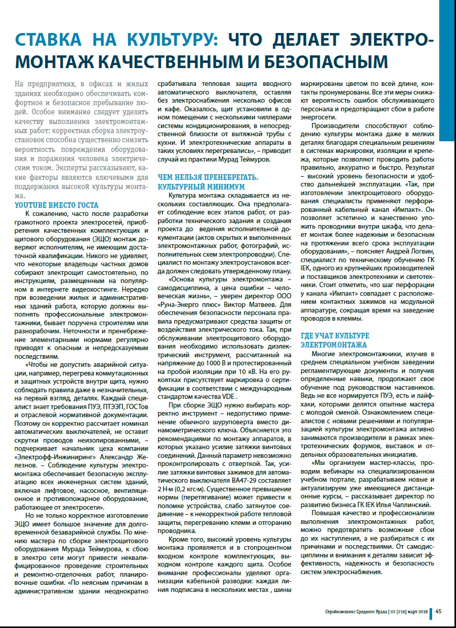 В журнале озвучены комментарии специалистов IEK GROUP по поводу энергоэффективного капремонта. Михаил Асейкин, специалист по техническому обучению, объяснил, насколько выгодно устанавливать светодиодные лампочки и многотарифные счетчики. Илья Чаплинский, директор по развитию бизнеса, рассказал о внедрении технологии «умный дом», Владимир Закускин, советник генерального директора Группы компаний IEK, объяснил ситуацию с общедомовыми расходами.