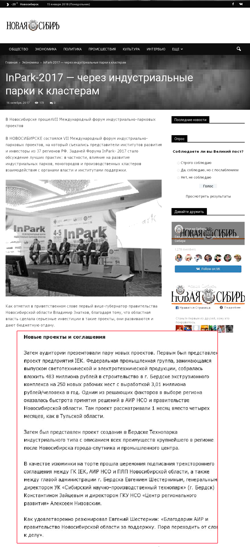 4 октября 2017 г. в рамках Новосибирского международного форума индустриально-парковых проектов InPark-2017 Группа компаний IEK подписала трехстороннее соглашение о строительстве нового производства в Новосибирской области. Этот проект будет реализован в г.Бердске, появится крупный производственно-логистический комплекс (ПЛК) ГК IEK на 250 новых рабочих мест.