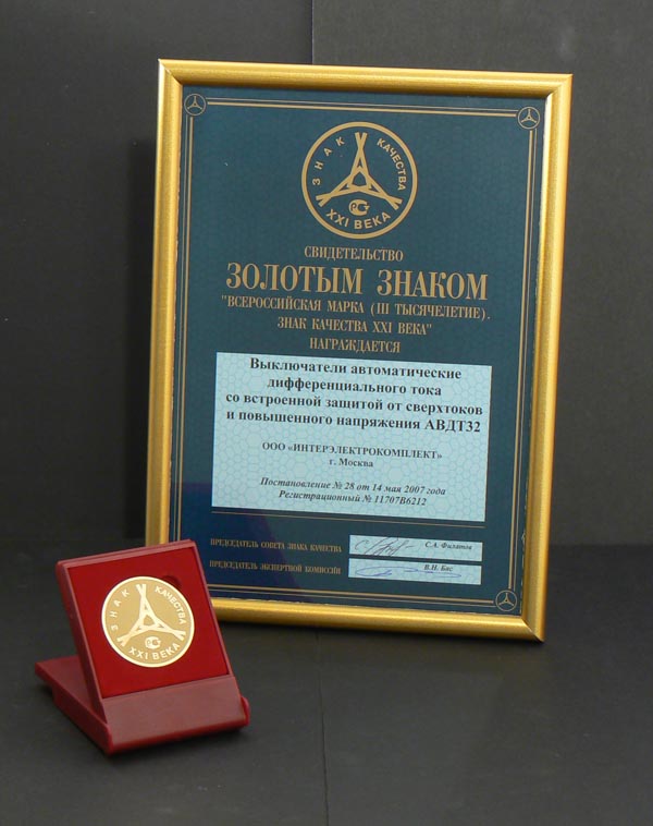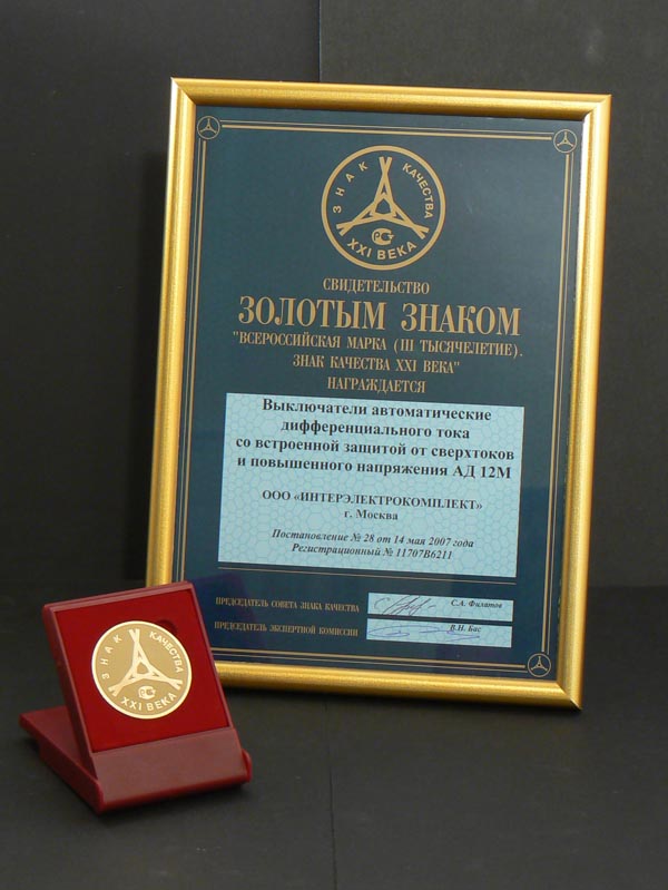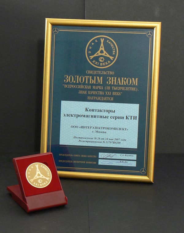 Контакторы КТИ, металлокорпуса, кабель-каналы, устройство дифференциальной защиты АВДТ32, выключатель автоматический АД12М, получившие Золотую медаль «Знак качества XXI века», теперь могут в течение двух лет маркироваться специальным знаком, эмблема премии с указанием года ее получения также будет использоваться в деловой документации и рекламных мате¬риалах. «Золото» национальной конкурсной программы «Всероссийская Марка (III тысячелетие). Знак качества XXI века» - еще одно убедительное доказательство высокого уровня продукции, выпускаемой под маркой IEK.