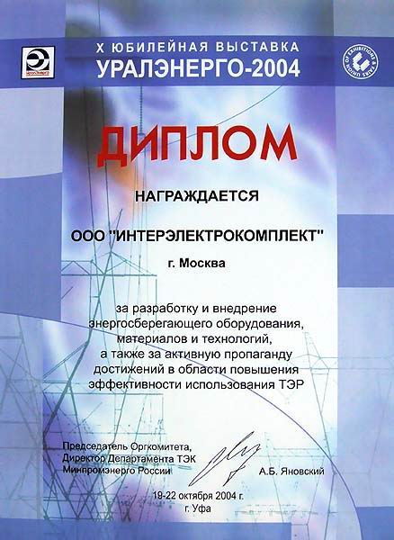 Диплом за разработку и внедрение энергосберегающего оборудования, материалов и технологий, а также активную пропаганду достижений в области повышения эффективности использования ТЭР подписан Председателем Оргкомитета, Директором Департамента ТЭК Минпромэнерго России А.Б.Яновским.