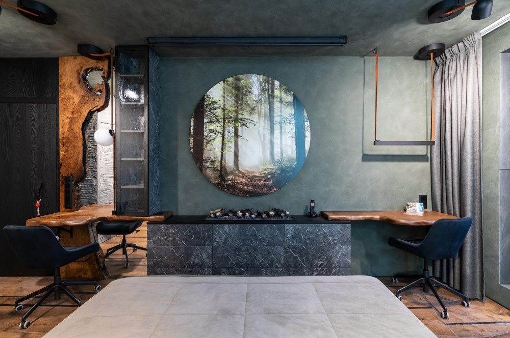 Необычный интерьер, навевающий мысли о сосновом лесе, горах и голубых озерах, создали дизайнеры очередного выпуска программы «Квартирный вопрос» на НТВ.