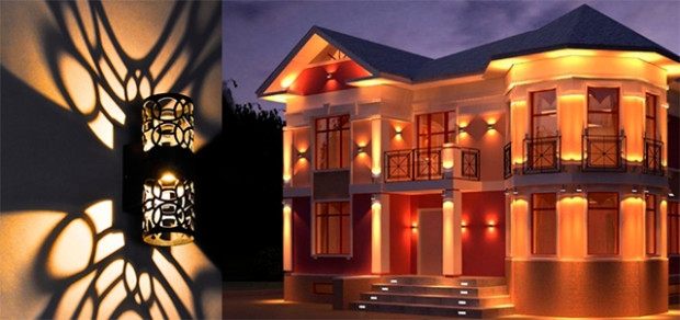 Декоративные уличные светильники 5100–5103 IEK создают фантазийный световой рисунок на стене загородного дома при включении.