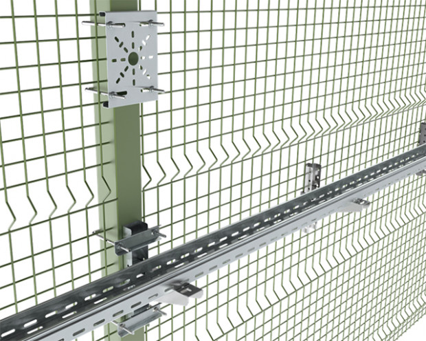Система монтажа лотков IEK® используется для организации прокладки кабельных трасс освещения, охранной сигнализации или видеонаблюдения вдоль охраняемого периметра на сетчатых панелях и опорах ограждений.