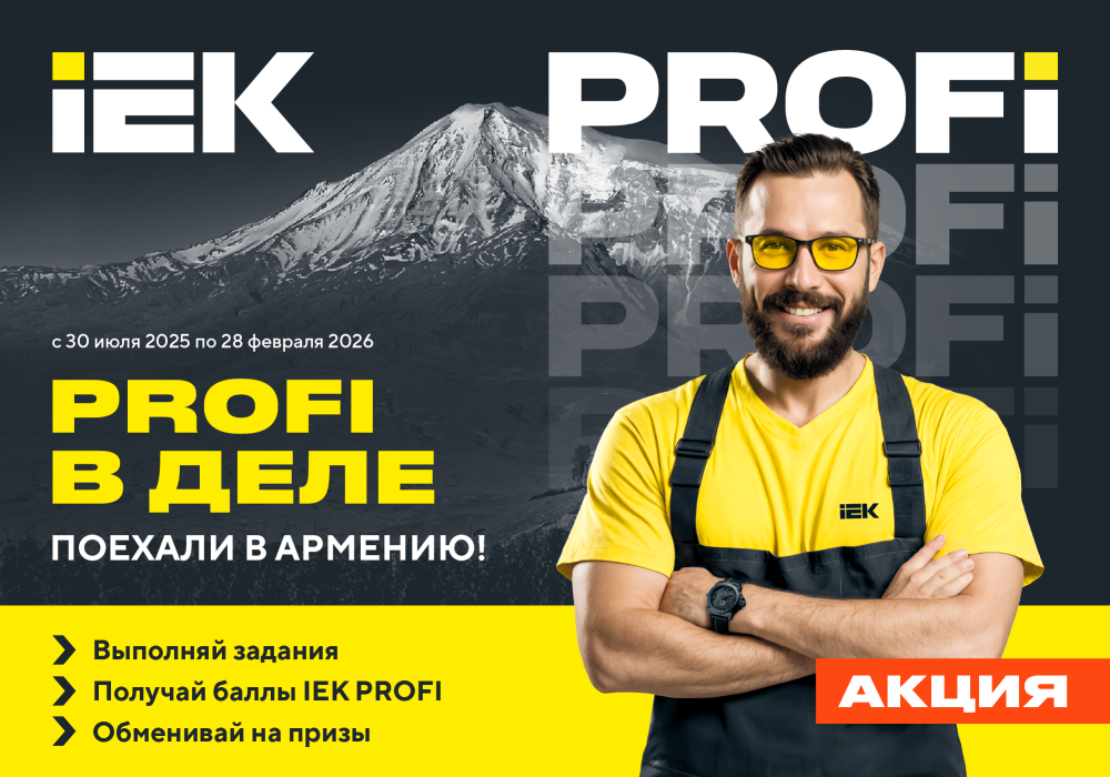 Акция «PROFI в деле» — с 31 июля 2025 года по 28 февраля 2026 года покупай продукцию IEK и выиграй поездку в Армению