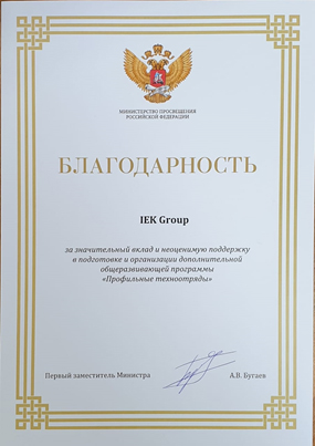 Министерство просвещения Российской Федерации выразило благодарность IEK GROUP за значительный вклад и неоценимую поддержку в подготовке и организации дополнительной общеразвивающей программы «Профильные техноотряды».