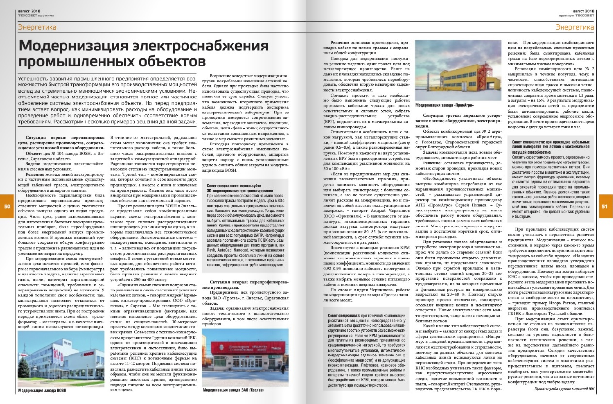Неотъемлемой частью модернизации предприятия становится полное или частичное обновление системы энергоснабжения. Игорь Рытов, главный энергетик производственного комплекса IEK GROUP в Ясногорске Тульской обл., объясняет, что стоит ориентироваться не столько на экономические параметры, сколько на уровень надежности и безопасности технических решений, а также на перспективы дальнейшего развития предприятия.