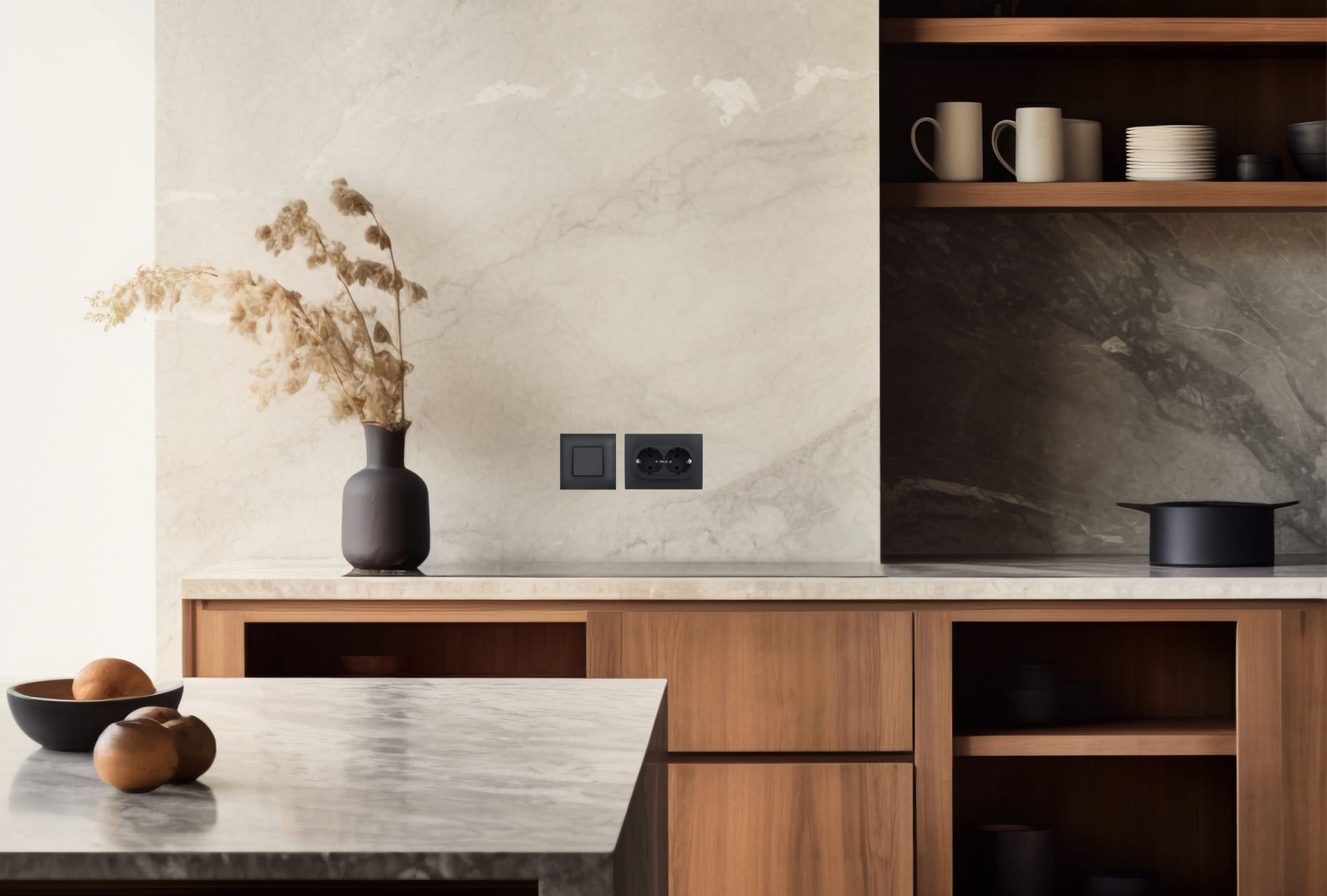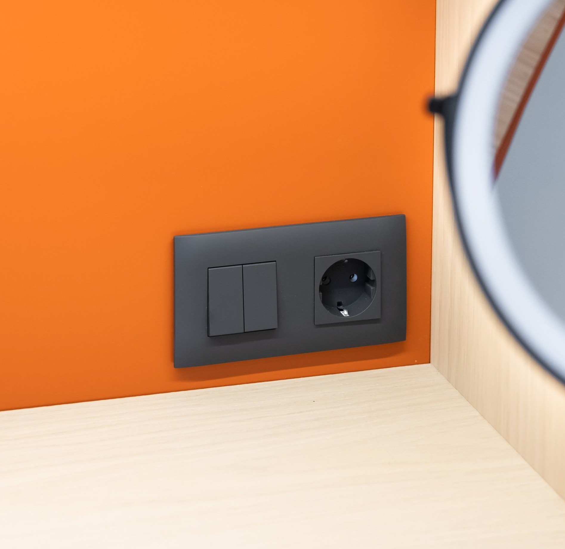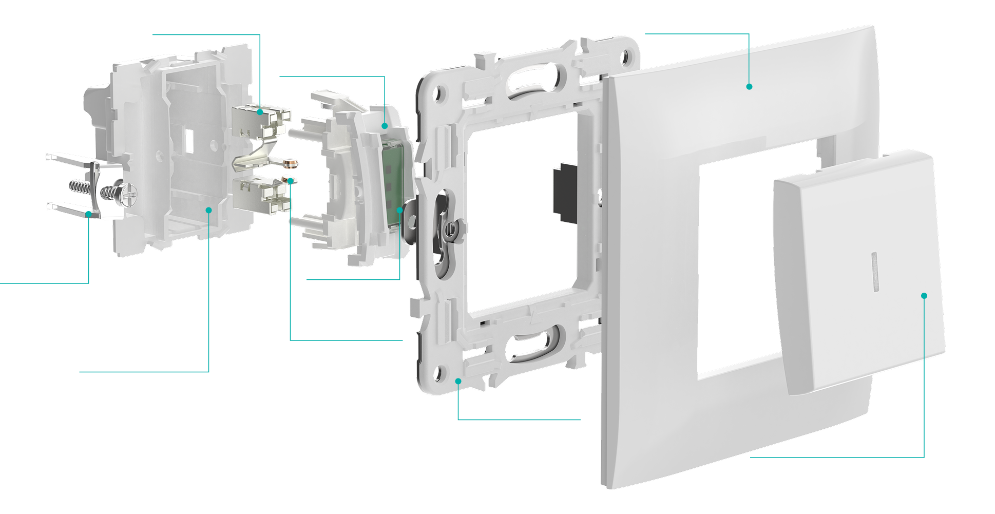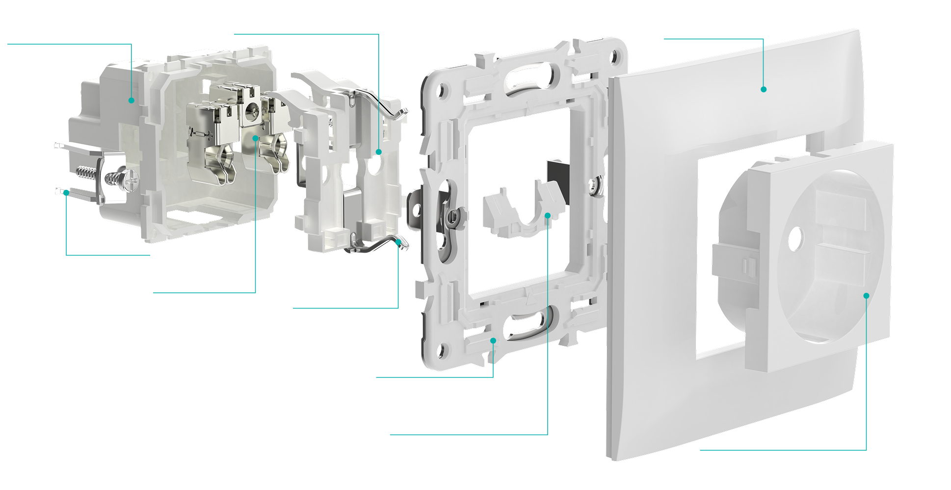 Тонкие и элегантные формы рамок плотно прилегают к стене, отсутствие видимых винтов на лицевой части розетки придает эстетическую чистоту